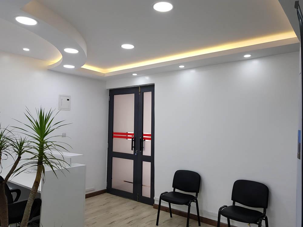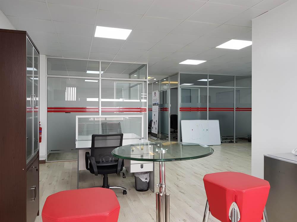 Simple yet elegant and open plan design is the theme behind the project. Light wooden floor board finish with acoustic ceiling complete with LED lights and a simple reception bulkhead design to complete the finish. Neutral walls and a corporate color on the partition and on the break out furniture to complete the look.